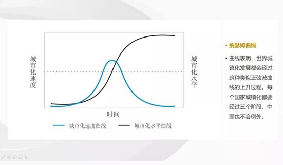 曲線表明,世界城鎮(zhèn)化發(fā)展都會經(jīng)過這種類似正弦波曲線的上升過程。每個國家城鎮(zhèn)化都要經(jīng)過三個階段,中國也不會例外。