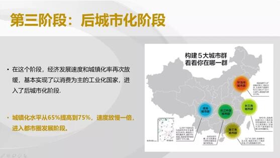 在這個階段,經(jīng)濟發(fā)展勢頭再次趨于平緩的成熟階段,這時,國家基本從以農(nóng)業(yè)社會為主轉(zhuǎn)型升級到以城市化消費為主的社會,進入了后城市化階段,城鎮(zhèn)化水平從65%提高到75%,減速發(fā)展。